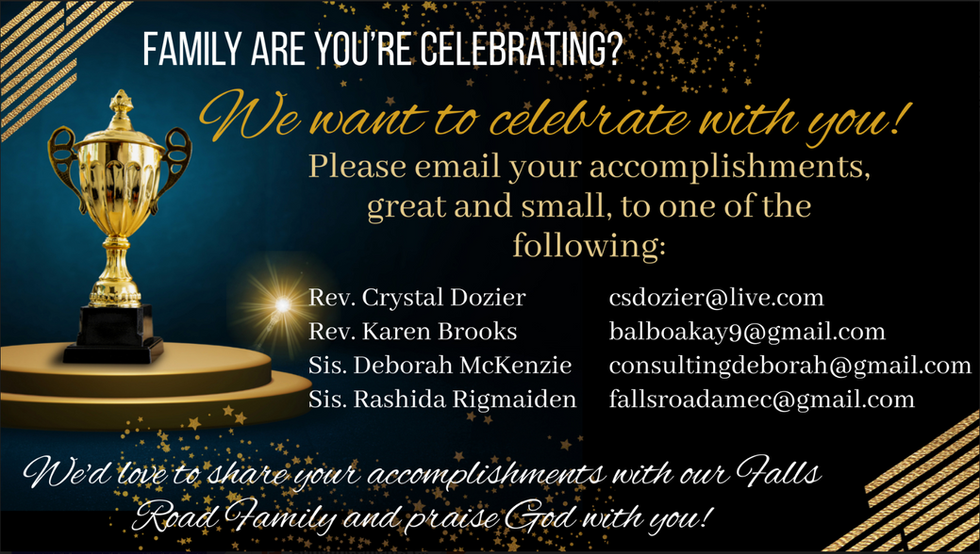 We offer various ministries for the spiritual uplift of our congregation and the surrounding community. We hope that those who are not current members, will consider making Falls Road AME Church your church home.